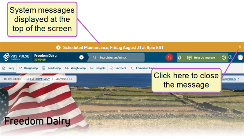 The VAS PULSE Platform team is able to post an alert when there is a system outage or upcoming downtime for system maintenance. These system messages are displayed at the top of the PULSE Platform screen, and you can click the X to the far right to close the message once you've read it. It will be displayed again if you refresh your browser window or log out and back in to the PULSE Platform.
